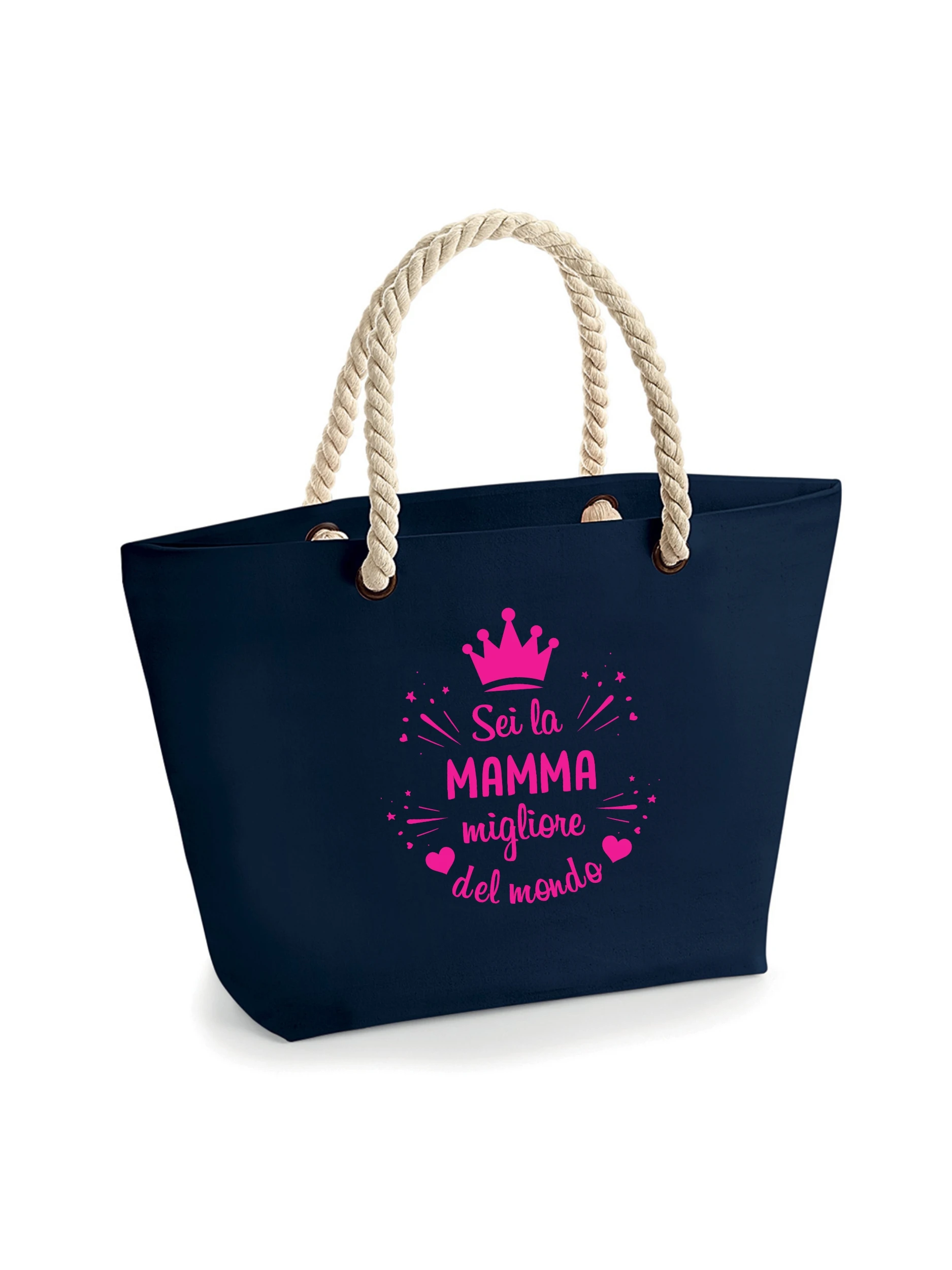 Borsa mare con design dedicato alla festa della mamma, manici in cotone robusto, può essere portata a mano o sulla spalla. Lunghezza manici: 37 cm, Dimensioni: 39 x 45 x 21 cm, Capacita’: 29 litri.