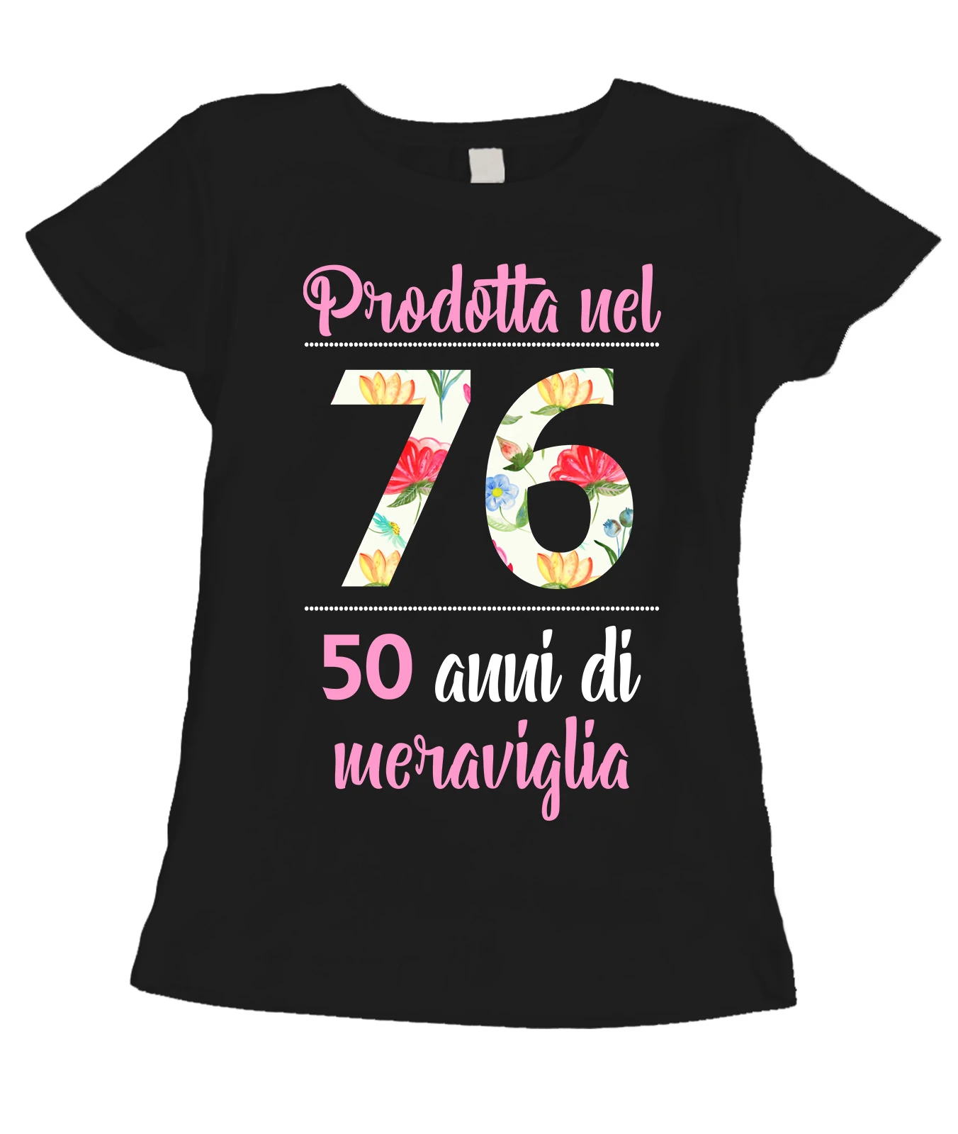 Maglietta compleanno 50 anni donna, idea regalo originale e simpatica per festeggiare un traguardo speciale. T-shirt realizzata in 100% cotone con stampa diretta su tessuto tramite inchiostri certificati: la stampa è morbida al tatto, traspirante e resistente ai lavaggi.