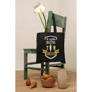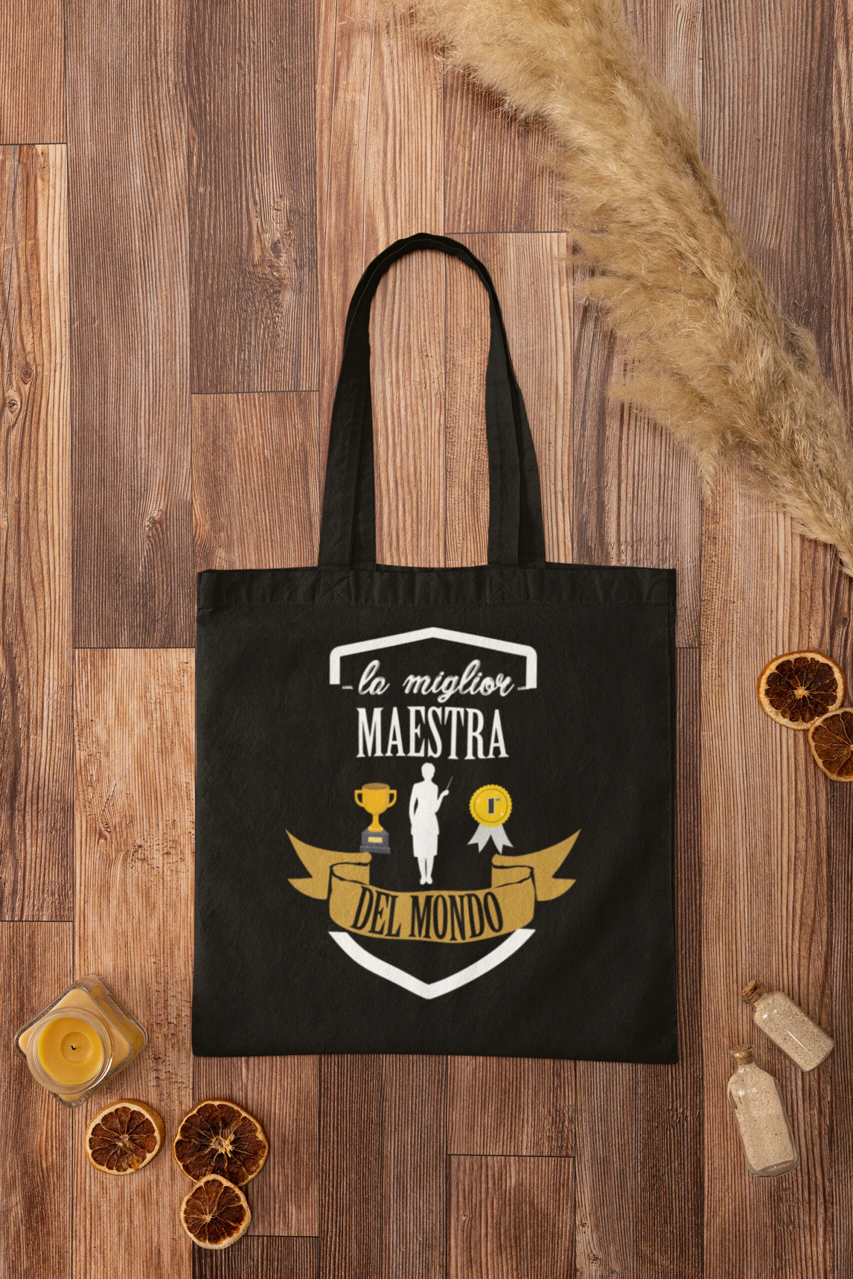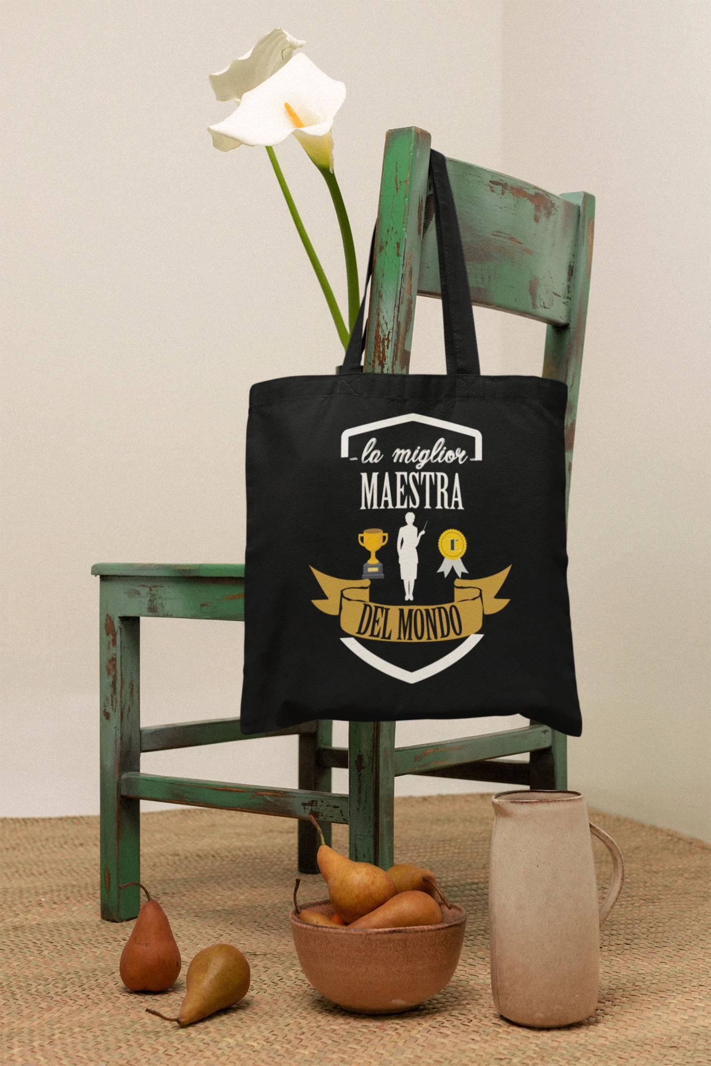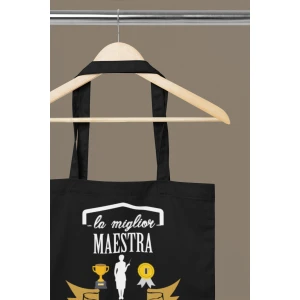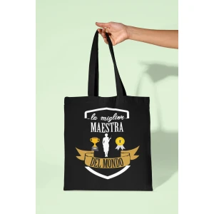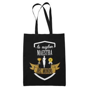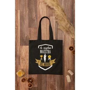 Shopping Bag Maestra La Miglior Maestra del Mondo Fine Anno Scolastico Nera in cotone