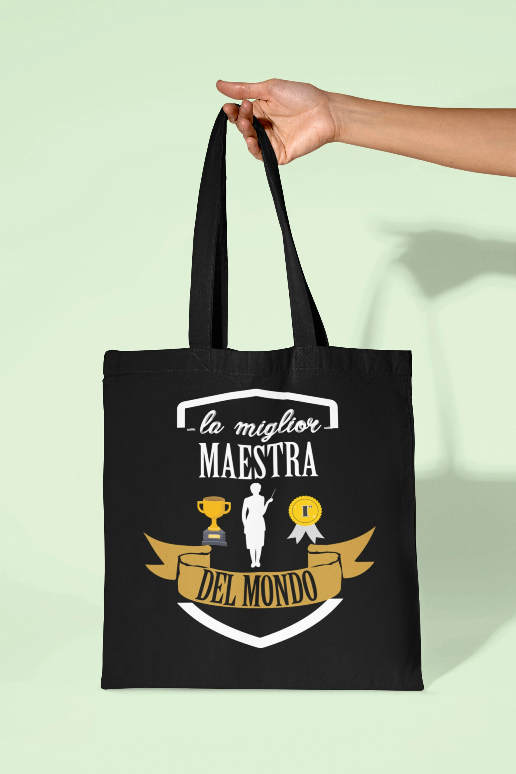 REGALO MAESTRA: La fine dell’anno scolastico si avvicina: festeggia la tua maestra con questa divertente shopping bag in cotone idea regalo adatto per la fine dell’anno.